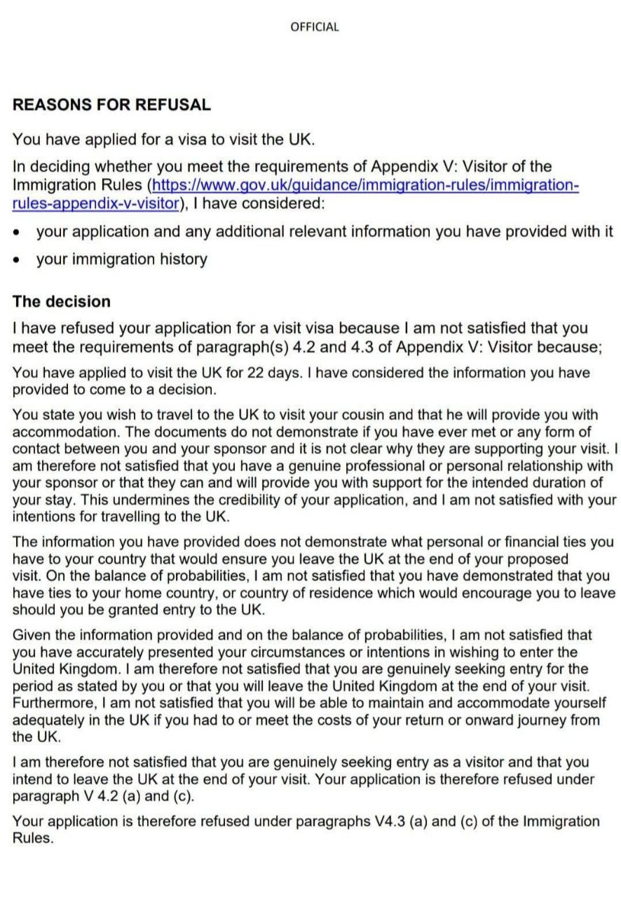- Lack of Genuine Purpose or Sponsor Credibility: A YouTube video from April 2025 outlines 7 common 2025 refusal reasons, including not proving a real relationship with sponsors (e.g., no prior contact evidence) and vague travel plans. One example involved a family visit where the applicant couldn’t show how they’d met the relative or why the sponsor was funding them, undermining credibility. This aligns with your letter’s point about no demonstrated contact with your cousin.